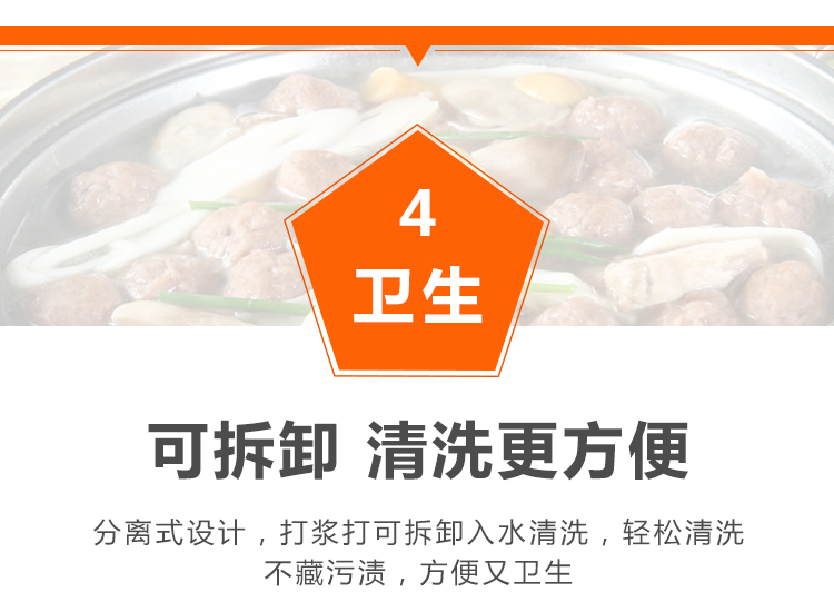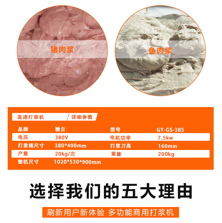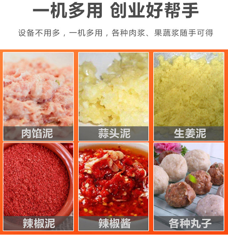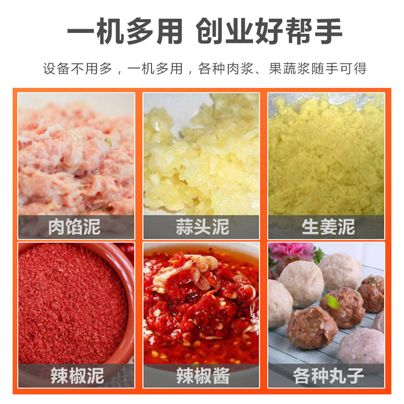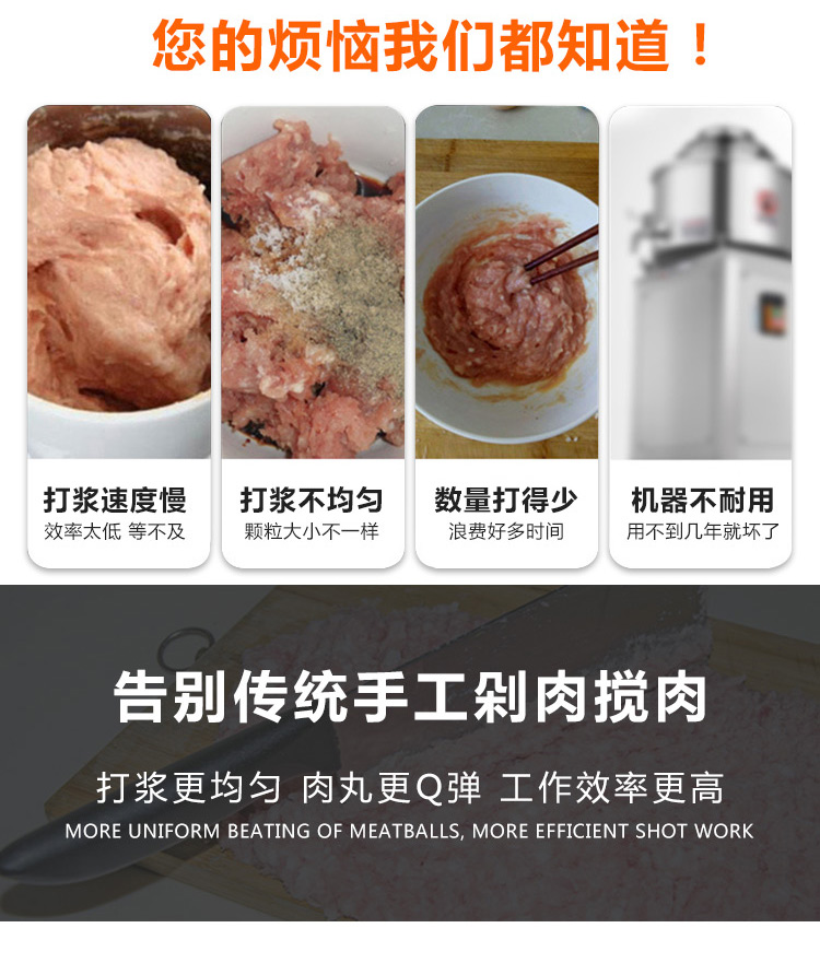 多功能肉丸打漿機擁有高速旋轉,達到快速碎食效果,讓打漿更細膩,讓您告別傳統手工剁肉攪肉打漿,將食材放入打漿機器入料口,食材由上至下翻轉打碎,讓肉餡不松散,細膩有勁道,此款38制冷高速肉丸打漿機,開機2-3分鐘即可完成打肉、配料、攪拌成漿。針對魚肉、豬肉、牛肉、等肉類纖維組織、改善了肉質脂肪纖維,生產出來的丸子外表光滑細嫩、低脂、口感爽脆,彈性好,韌性好,是潮州魚、肉丸的打漿設備