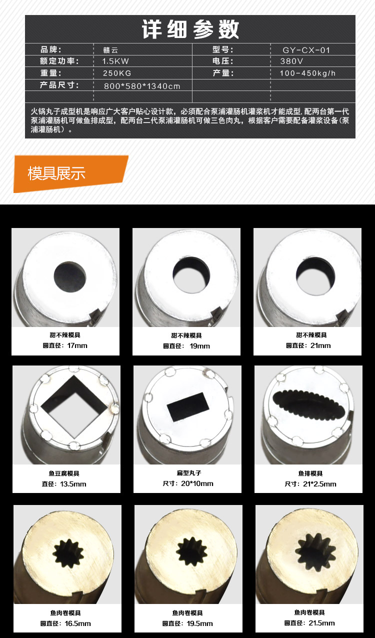 多功能火鍋丸子成型機用于配合泵浦灌腸機制作海螺丸造型和其他不規則造型火鍋料丸子設備。隨機有十多套模具,可制作十二種形狀丸子,但是這臺設備不能單獨工作,必須配合泵浦灌腸機灌漿才能成型。配兩臺一代泵浦灌腸機可做魚排成型,配一臺一代泵浦灌腸機一臺二代泵浦灌腸機可做三色肉丸,根據客戶需要配備灌漿設備(泵浦灌腸機) 。