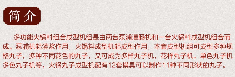 多功能火鍋料組合成型機組是由兩臺泵浦機和一臺火鍋料成型機組合而成,泵浦機起灌漿作用,火鍋料成型機起成型作用,本套成型機組可成型多種規格丸子,多種不同花色的丸子,又可稱為多樣丸子機,花樣丸子機,單色丸子機,多色丸子機等等。