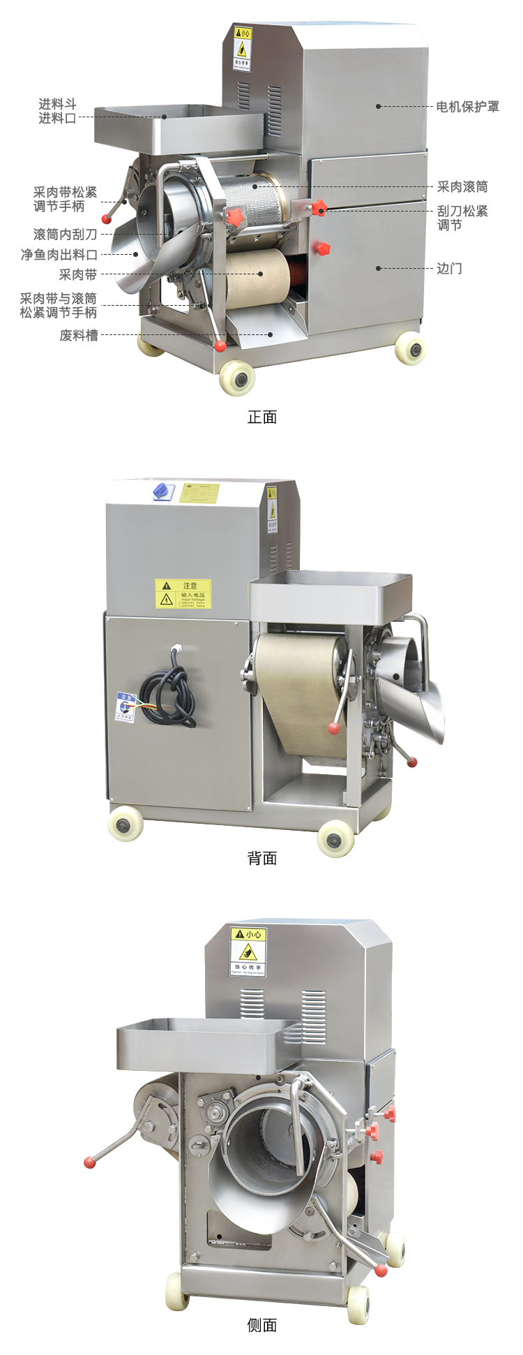 贛云系列不銹鋼200型魚肉采肉機又稱為去魚骨機,采用擠壓原理將魚肉跟魚皮和魚骨分離開來,達到采魚肉的作用,這樣分離出來的魚肉含魚骨較少,還含有少量的魚筋、魚血等雜物,一般可使用魚糜精濾機過濾一遍,可使魚肉色純,魚肉更細膩,生產高品質魚糜制品。