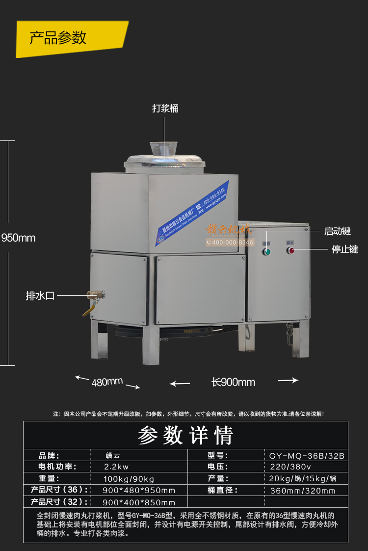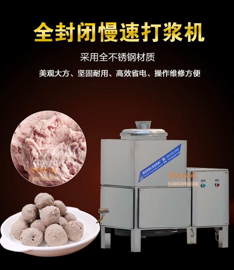 款全封閉慢速肉丸打漿機,型號GY-MQ-32B型,采用全不銹鋼材質,在原有的32型慢速肉丸機的基礎上將安裝有電機部位全面封閉,并設計有電源開關控制,尾部設計有排水閥,方便冷卻外桶的排水,以全新的面貌上市。贛州市贛云食品機械廠,致力于打造魚肉丸加工設備影響力企業之一!