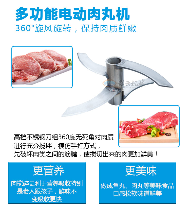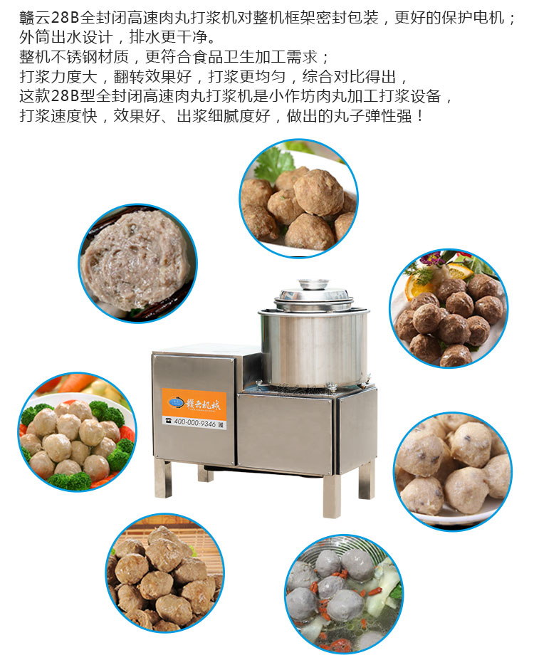 贛云牌28型全封閉高速肉丸打漿機對電動機密封包裝,更好的保護電機,外筒出水口底部設計,排水更干凈,整體不銹鋼材質,更符合食品衛生加工需求,打漿刀角度大,翻轉效果好,打漿更均勻,綜合對比得出,這款28型全封閉高速肉丸打漿機是小作坊肉丸加工優選打漿設備,打漿速度快,效果好,出漿細膩度好,做出的丸子彈性強!