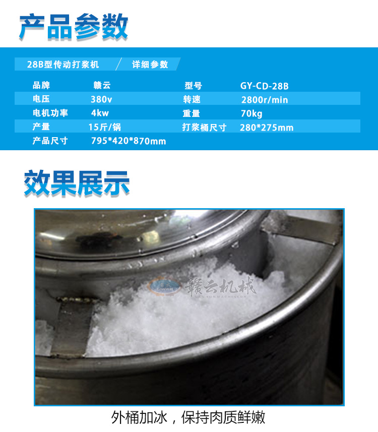 贛云牌28型新款全封閉傳動式肉丸打漿機,高速肉丸機采用優質不銹鋼板材加工精制而成,符合食品衛生加工需求,打漿刀型角度大,翻轉效果好,大皮帶輪帶小皮帶輪傳動適當增加打漿速度,配用4.0kw二極高速純銅線電機,整個機器底部被不銹鋼板材封裝,使用更安全!