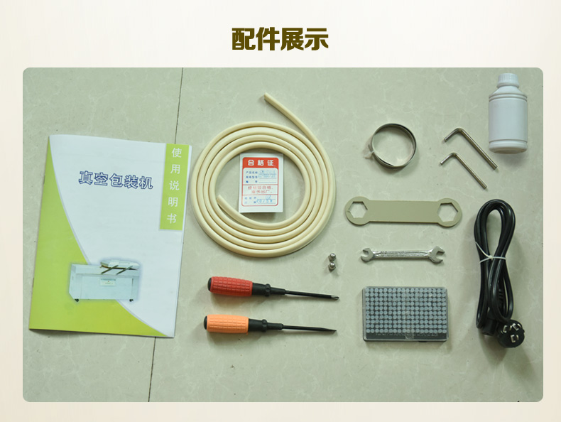 2、將所需包裝的物品裝入包裝袋【塑料復合袋或鋁箔復合袋】內(nèi),放入真空室內(nèi),提起壓條,均勻的把袋口置于熱封架上排好,然后放下壓條。
