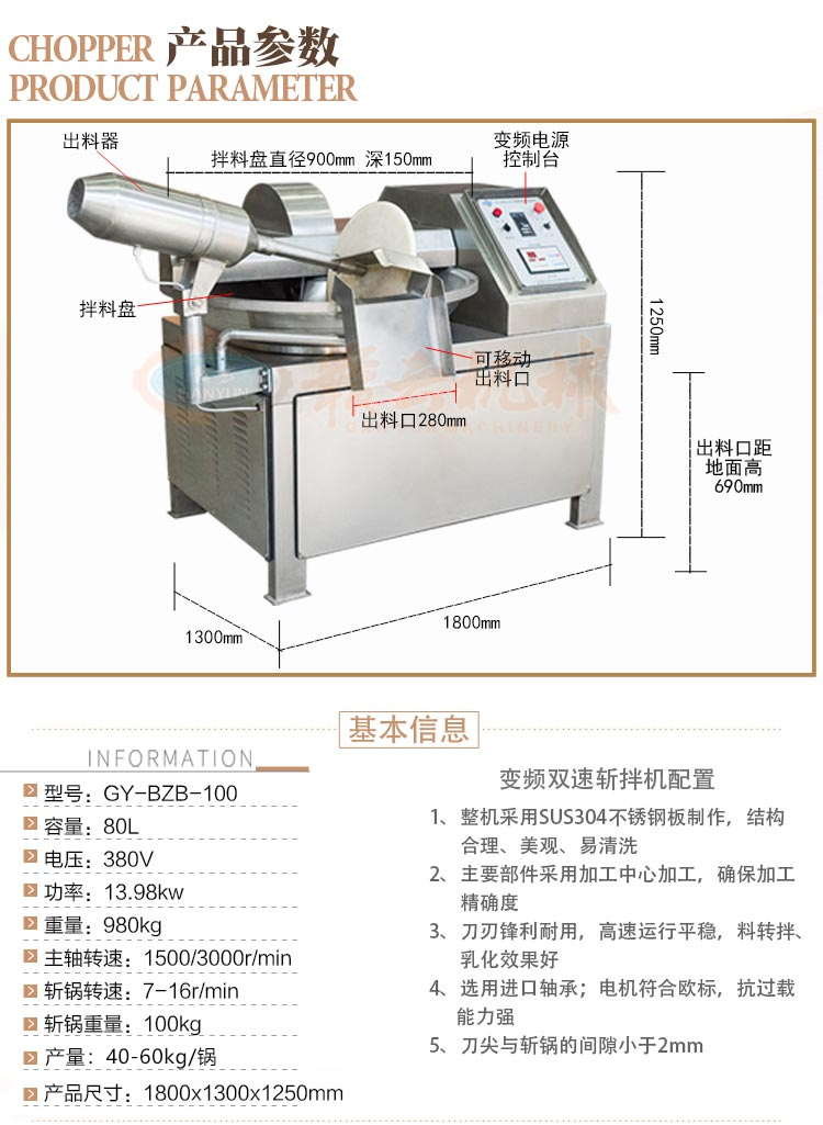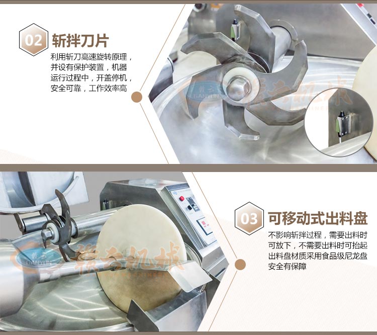 斬拌機是肉類制品生產制作工藝中的一個關鍵設備,斬刀的高速旋轉將原料斬碎,同時料鍋的旋轉使原料斬拌均勻。適用于制作腸類、丸類等肉制品加工設備,它不僅能將塊狀原料精細的切碎,還能同時將其它的原料,如水、調味品等附加原料一起攪拌成均勻的乳狀物,提高原料的乳化程度,且不會出現拖油現象,對改善產品的口感,提高產品的出品率起到了關鍵的作用。適用范圍:廣泛應用于蔬菜加工、肉類加工、豆制品加工等,是生產肉丸,烤腸類、千頁豆腐、魚豆腐,餡料斬切加工,雞蛋干制作等的推薦設備。
