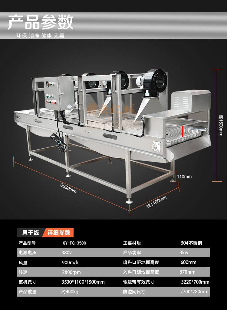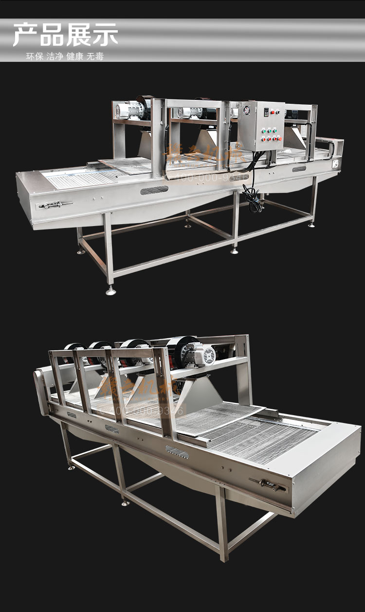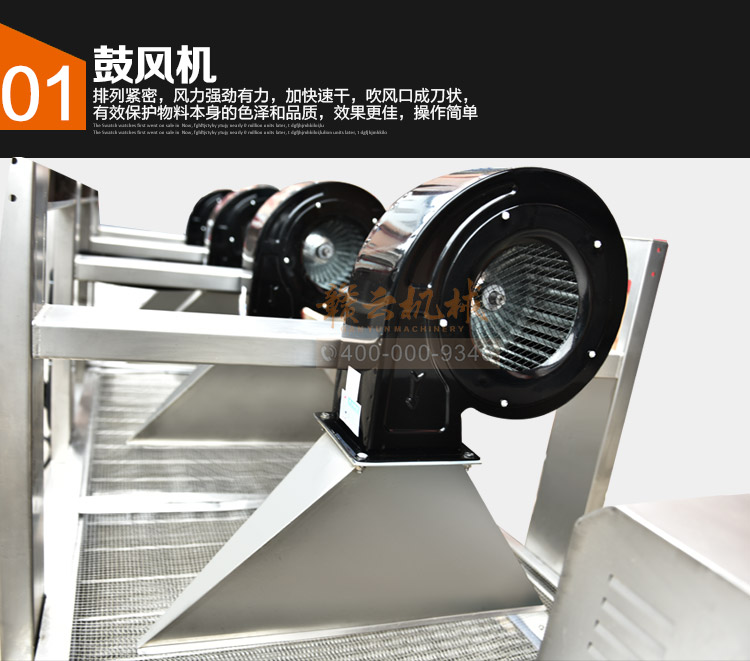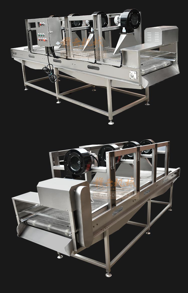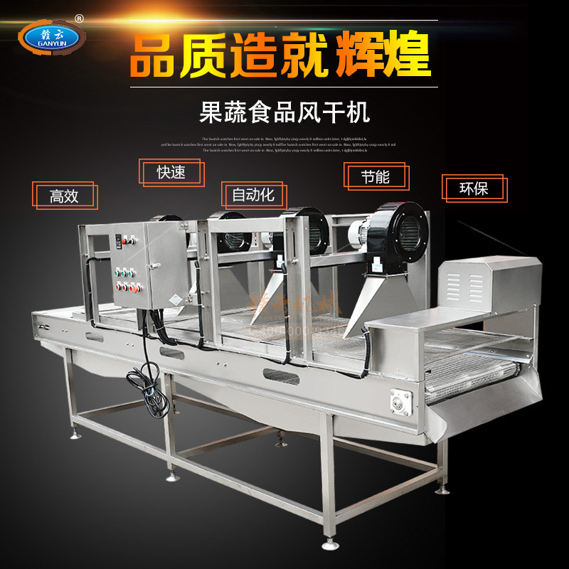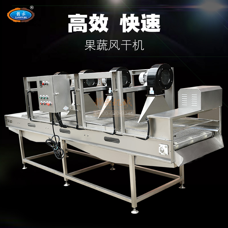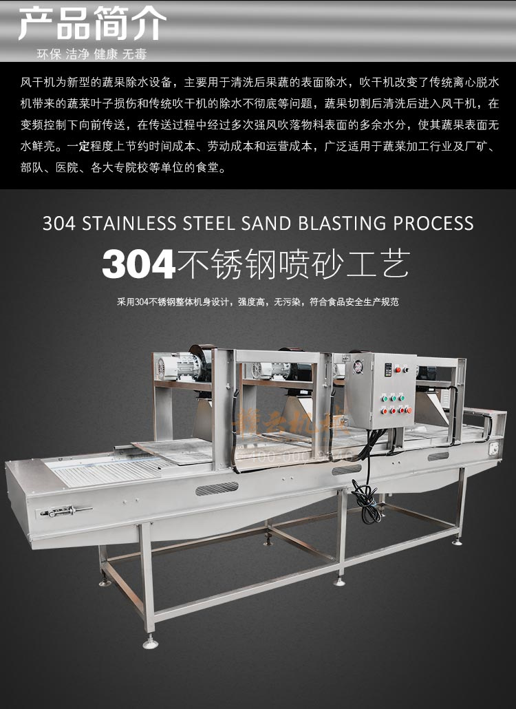 果蔬食品風干機,高效、快速、環保、安全、自動化。強風去除表面水分+震動輸送。果蔬食品風干機主要用于清洗后的果蔬去除表面水,震動吹干改變了傳統離心脫水機帶來的蔬菜也損傷和傳統風干機除水不徹底等問題,蔬果切割后清洗后進入震動風干機,在震動頻率下使物料向前傳送,在傳送過程中經過多次強風吹落物料表面的多余水分,使其蔬果表面無水鮮亮。最大程度上節約時間成本,勞動成本和運營成本,廣泛適用于蔬菜加工行業及廠礦、部隊、醫院、各大院校等單位食堂。