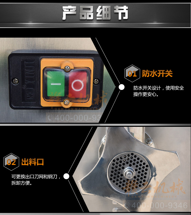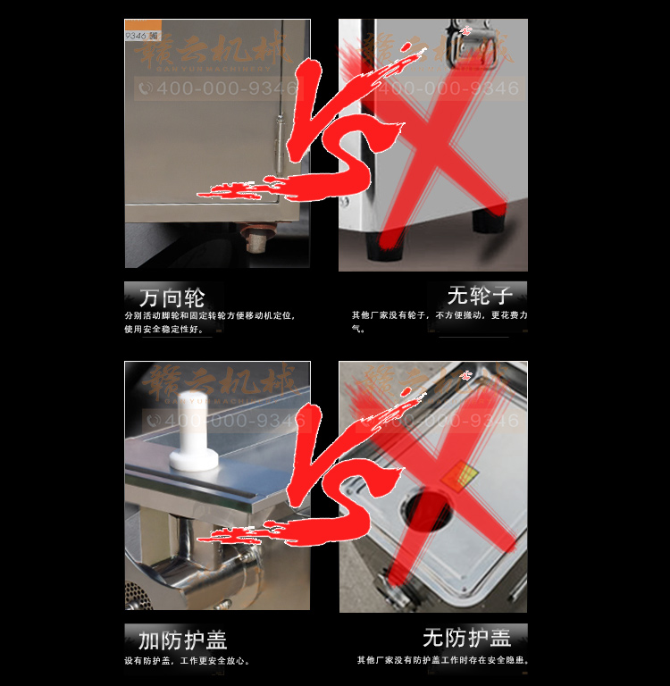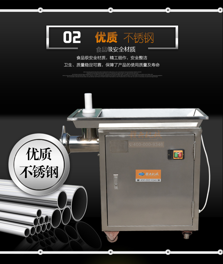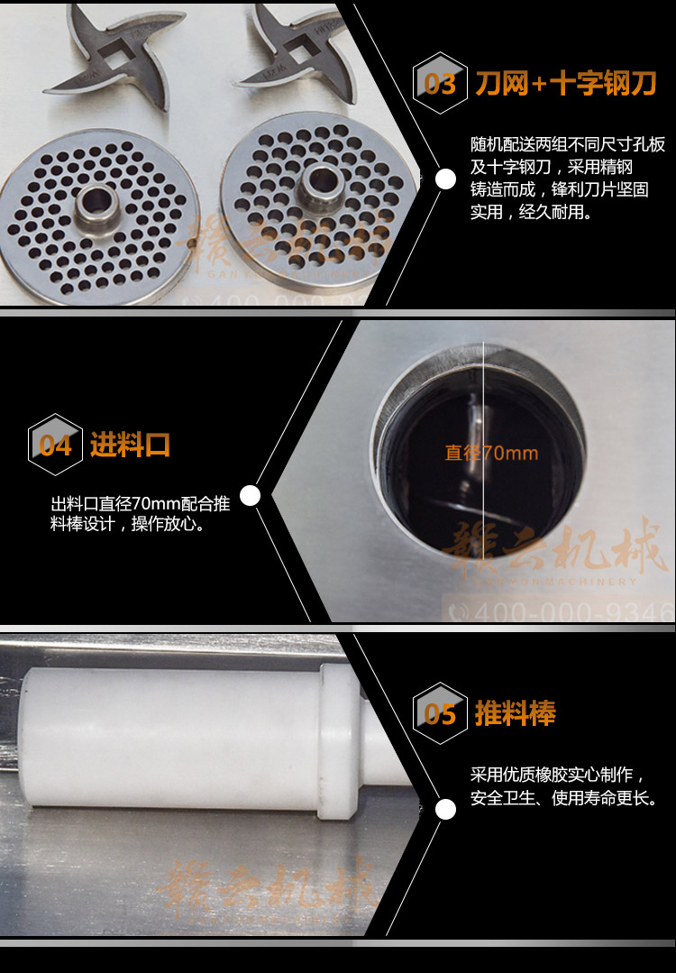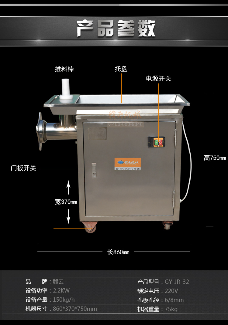 贛云牌32型不銹鋼立式絞肉機,防水開關,二級減速,齒輪鏈條傳動,接觸食品部位全部不銹鋼材質,配6mm、8mm刀網,兩個十字刀,并配實心推料棒!絞肉就是不一樣。