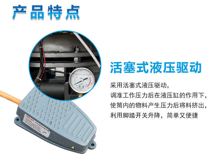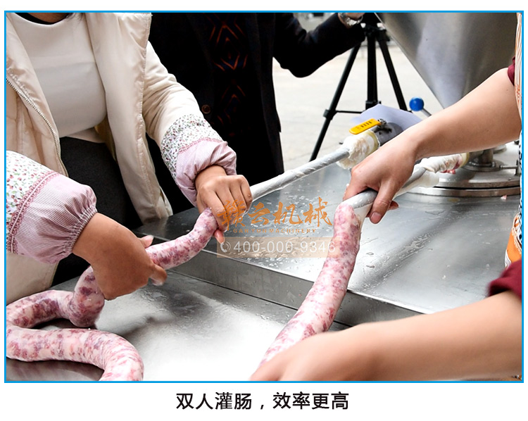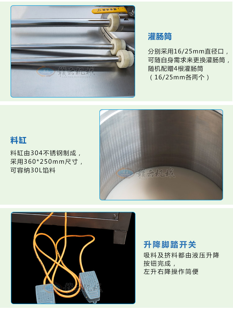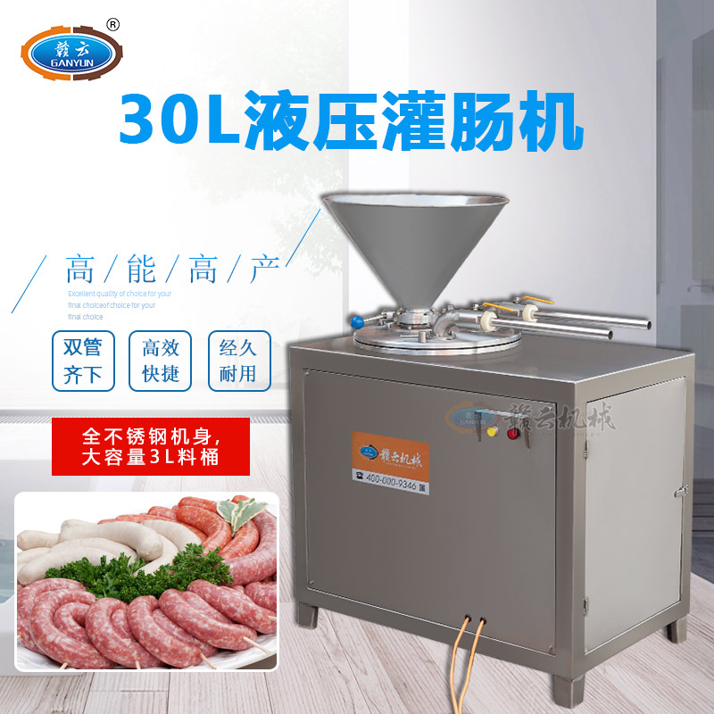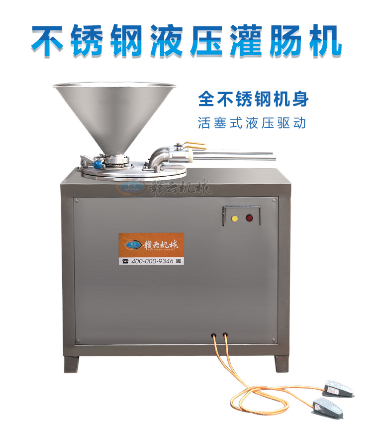 贛云食品機械旗下液壓灌腸機,新款灌漿制腸,此款雙管灌腸機采用液壓灌漿推料原理設計,設備密封性能良好,配合雙管灌漿提高灌腸產量,設備可自動調節灌漿,自動吸料,腳踏開關控制讓人操縱自如。是一款實用的灌漿制腸設備。 注意事項:首次使用前必須加入一桶16KG的46#液壓油