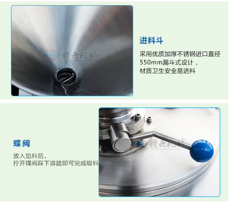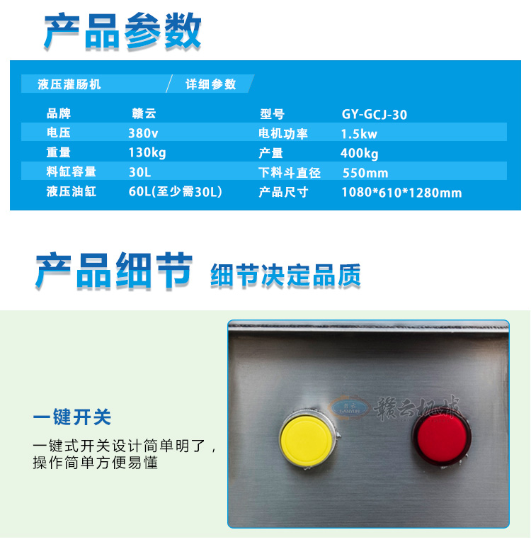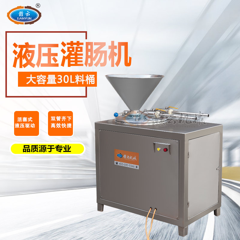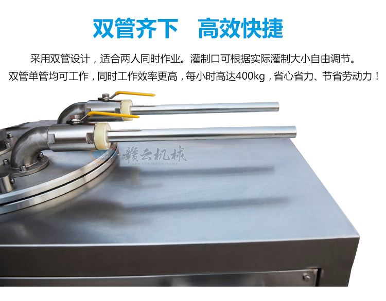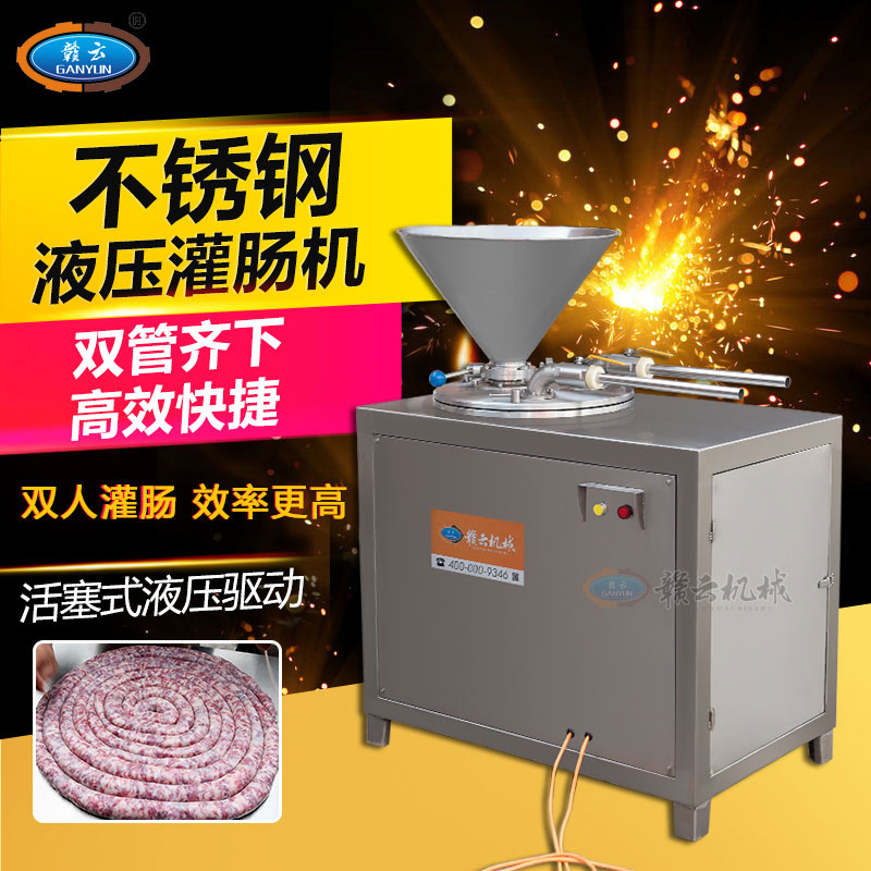 贛云液壓灌腸機,新款灌漿機,雙管灌腸機采用液壓灌漿推料原理設計,密封性能良好,配合雙管灌漿,可自動調節灌漿,自動吸料,腳踏開關控制操縱自如。是腸類灌腸設備。
