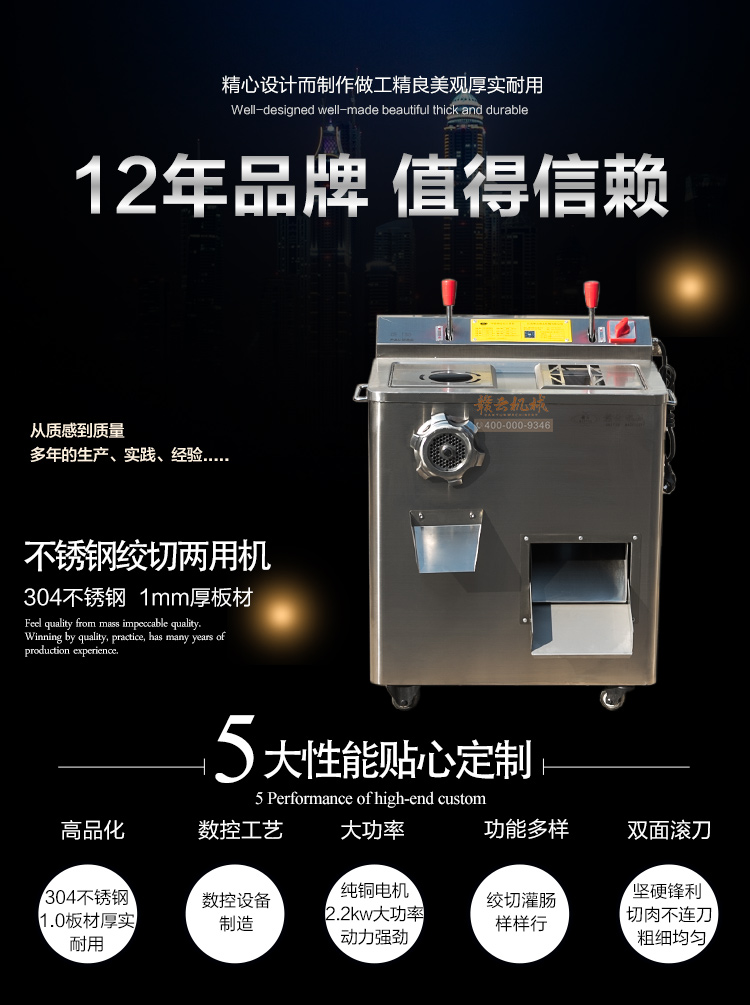 贛云2017款304不銹鋼絞切機上市,火熱開賣中,裝配2.2kw 大功率純銅電機,采用1mm標(biāo)準(zhǔn)厚304不銹鋼板材封裝,離合開關(guān)設(shè)計,絞肉切肉一體。適合高端酒店場所之用,同樣也適合品質(zhì)優(yōu)質(zhì)店鋪和檔口絞肉切肉之用。十二年品質(zhì)保證,值得擁有!