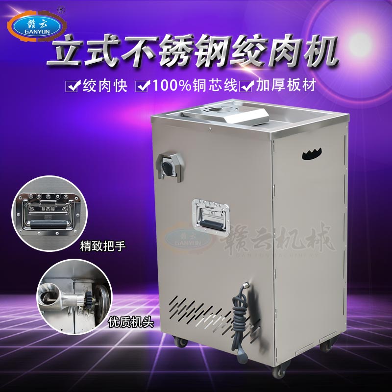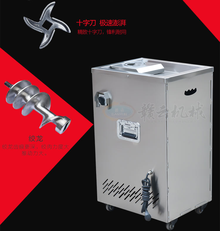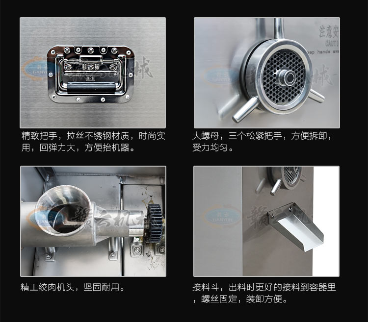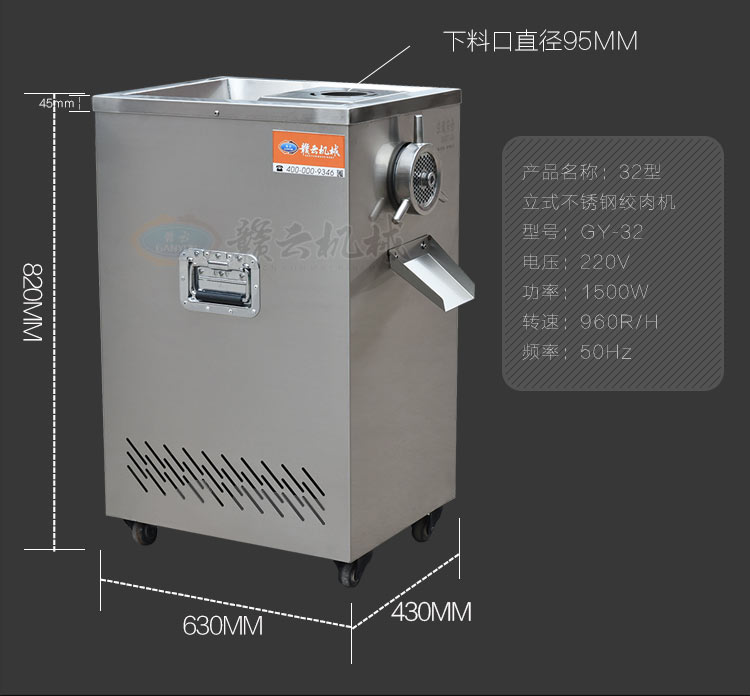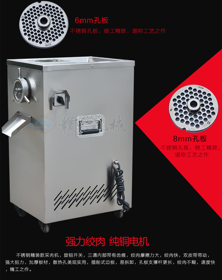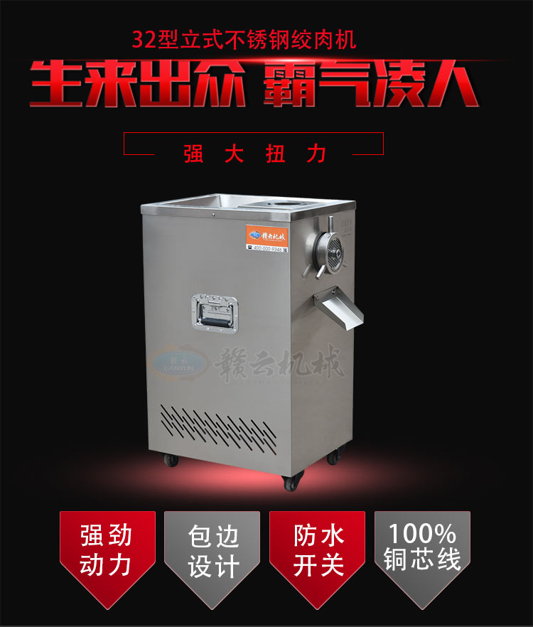 32型立式不銹鋼絞肉機(新),不銹鋼精裝款采肉機,旋鈕開關,三通內部帶有齒痕,絞肉摩擦力大,絞肉快,雙皮帶帶動,強大扭力,加厚板材,散熱孔美觀實用,插銷式邊板支撐桿更長,絞肉不糊,速度快,精工之作。
