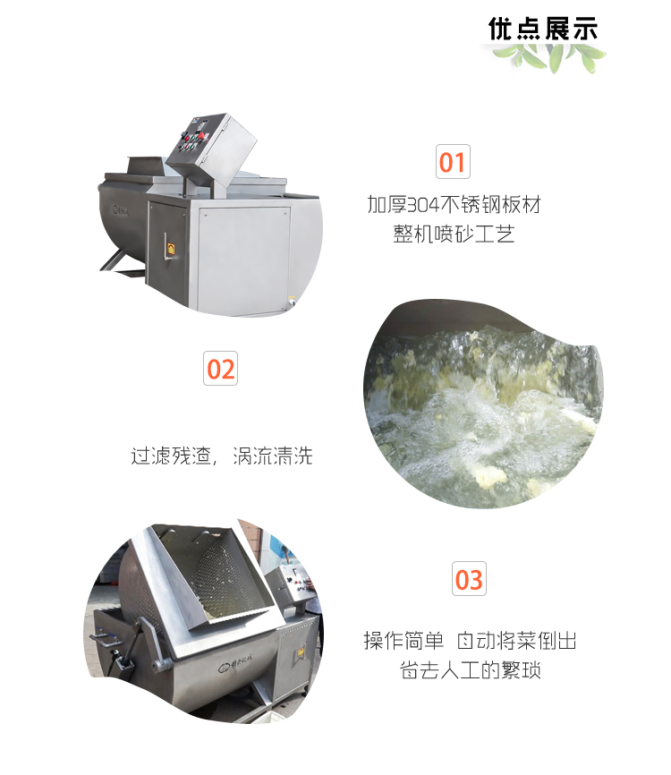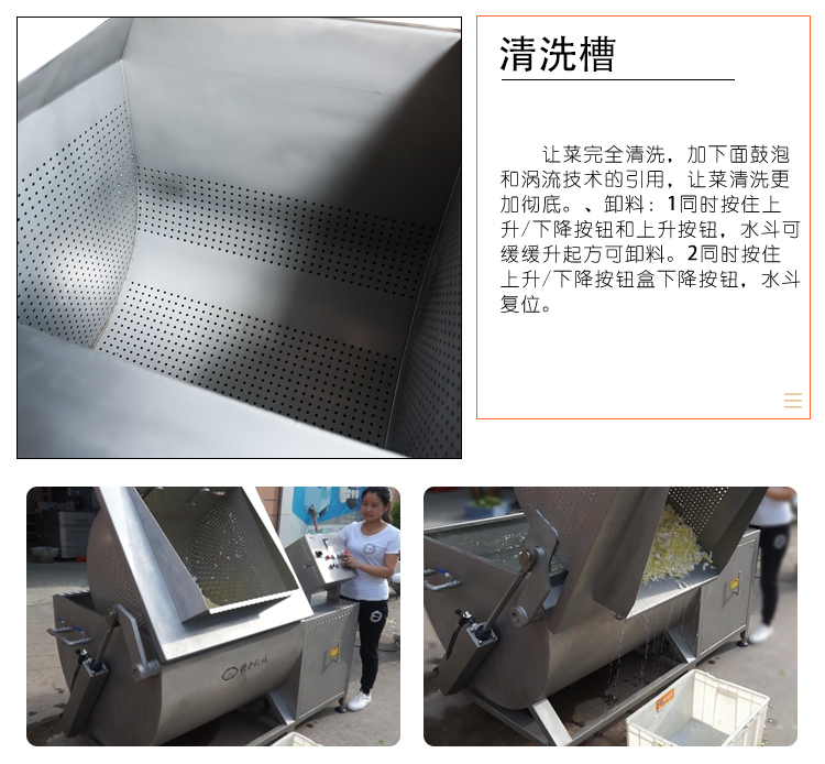 多功能清洗機,采用sus304不銹鋼材質,噴砂亞光處理。采用先進技術,自動化控制,清洗時間可在0-30分鐘內自由設置;翻轉裝置設計,可通過電控箱控制升降臂桿升降不銹鋼瀝水筐。清洗槽U型設計,泥沙污垢沉降底部,渦流清洗系統,清洗徹底且不損傷蔬菜,適合大部分果蔬的清洗,例如清洗切割好的各種蔬菜以及洋椒、豆角茄子、辣椒、筍干等。
