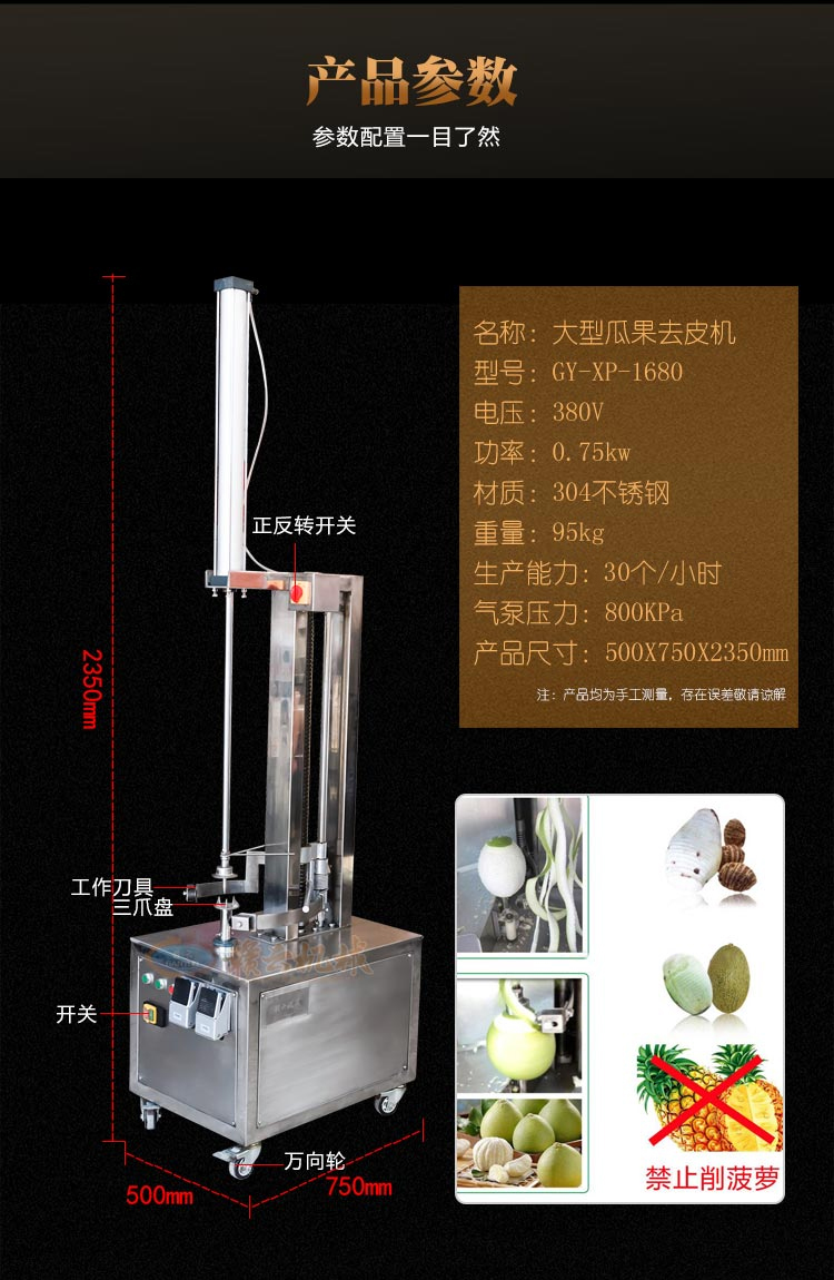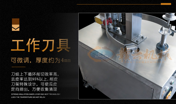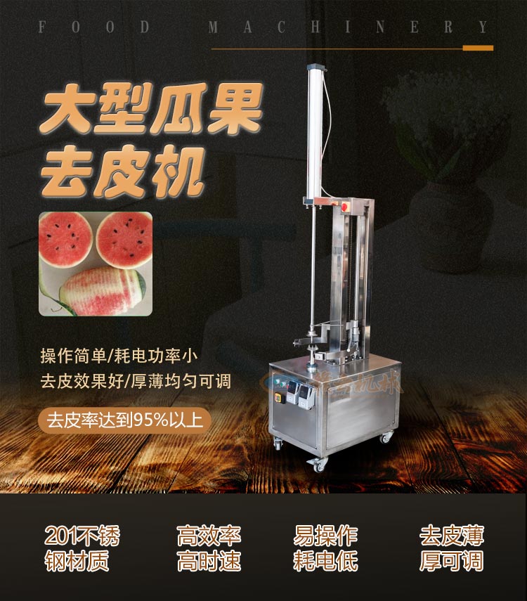 電動不銹鋼大型瓜果去皮機適用于木瓜,南瓜,冬瓜,哈密瓜,柚子等大中型瓜類削皮,削皮厚薄可調。刀組上下循環削切效率高,去皮率高達95%以上。削皮刀架特殊設計,可使瓜皮定向排出,方便收集清理。機器拆洗方便,使用時操作簡單,清洗方便,安全衛生。去皮機適用于餐飲行業,飯堂,食品加工廠,冷凍食品廠,休閑食品廠,西餐店設備,飲品店設備,茶餐廳等。防水開關,可調厚度,鋼質刀片耐用不生銹。它是大型工廠、學校、伙房等食堂理想的去皮工具。