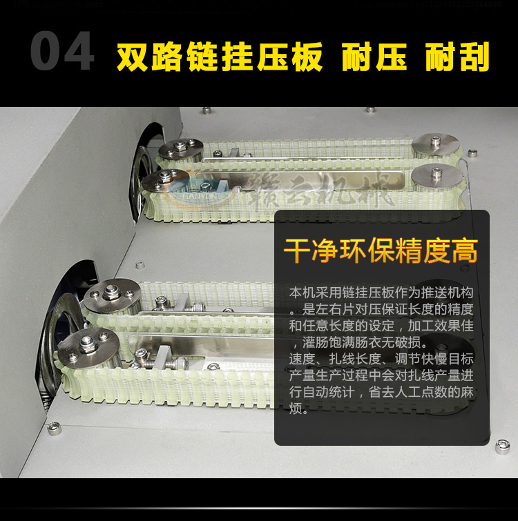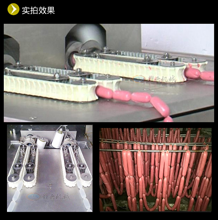 全自動動雙路高速香腸扎線機,自動分份,自動繞線,全程自動化控制。該機采用了優質電機和本公司自主研發的控制系統,機身全不銹鋼制造、效率高、易操控、節約生產原料等優點,產品長度的調節可以隨心所欲