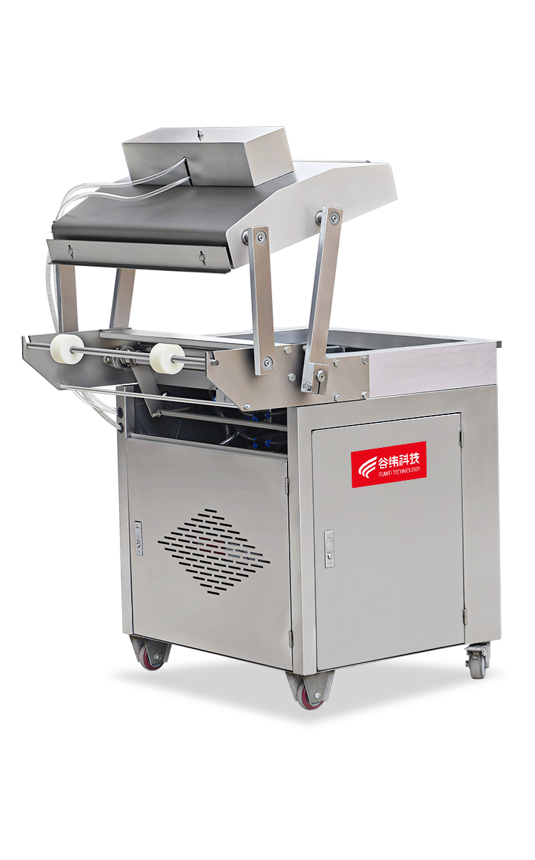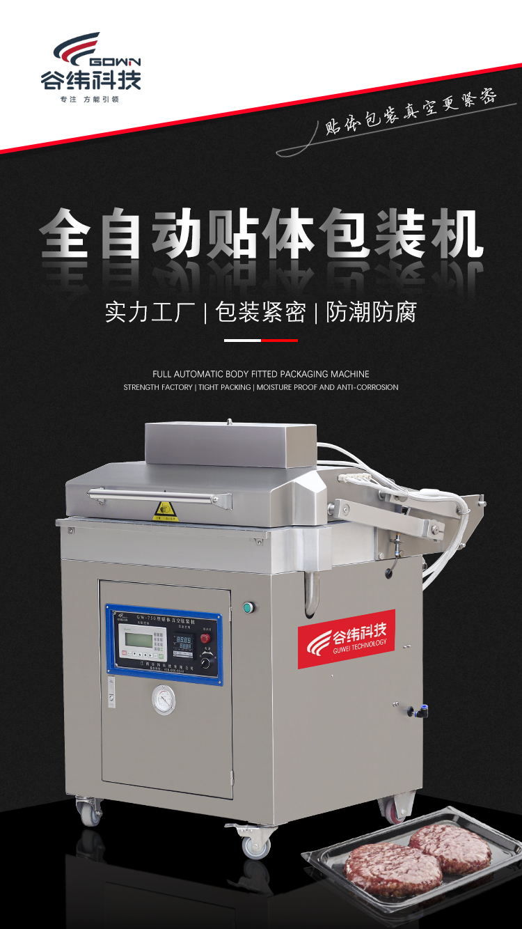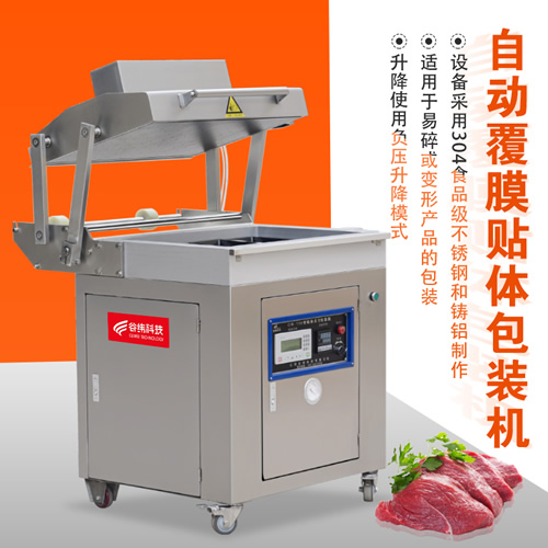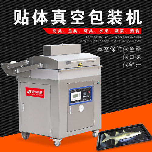 貼體真空包裝機的原理是:采用低粘度的復合膜,將物料放在下模板的托盒或膜上,在真空狀態下,將加熱板產生的熱量通過排風口 送到真空室內,給低粘度復合膜瞬間通體加熱,復合在一起,達到真空包裝的效果。 這類包裝是將膜加熱軟化后再收縮包裝,因此,不存在在包裝有尖角、硬刺的物品時將膜刺破的現象。該種包裝沒有破損率。