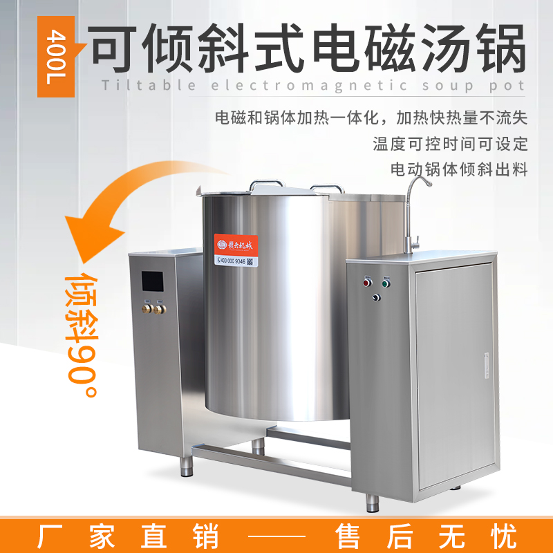 大容量可傾斜式電磁湯鍋,使用不銹鋼材質,鍋體多重聚能環使鍋體受熱均勻,熱能快速轉化并且受熱后不易冷卻,湯鍋采用可搖擺設計,方便清洗和出料,并且擁有400L大容量設計,每一次熬湯、熬粥、鹵肉、食品加熱更大量,此款商用湯鍋廣泛用于中央廚房,預制菜加工、酒店、食堂等場所