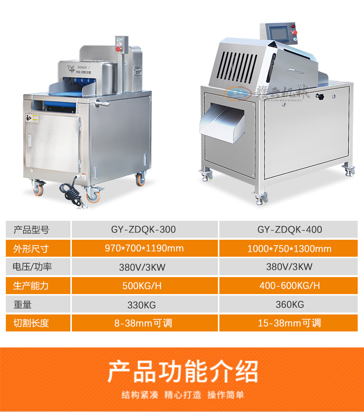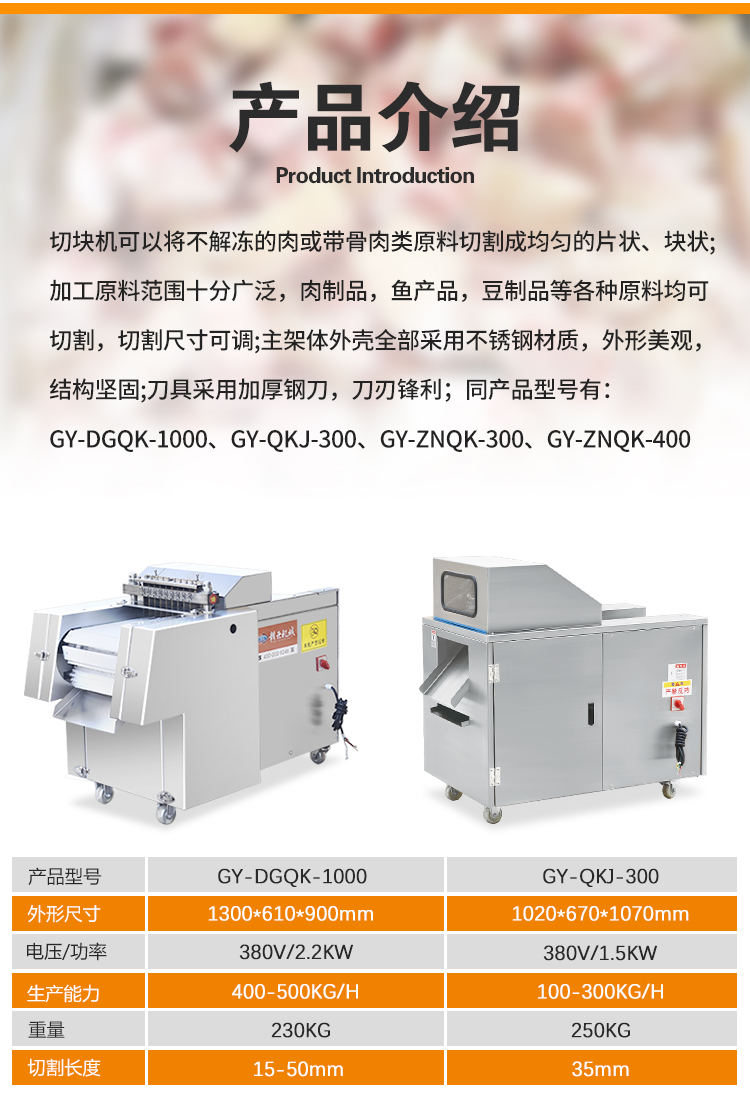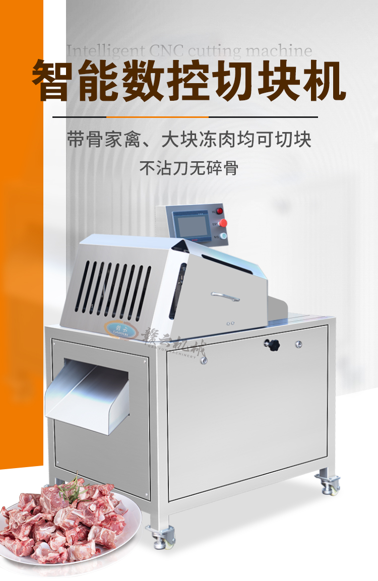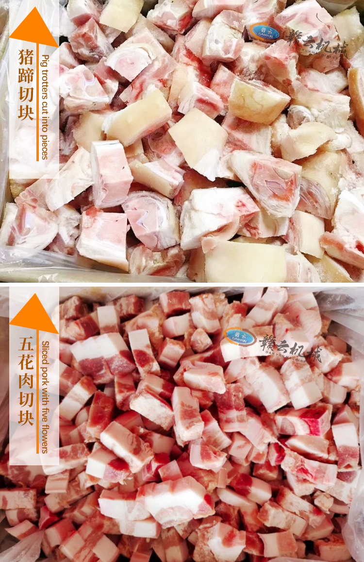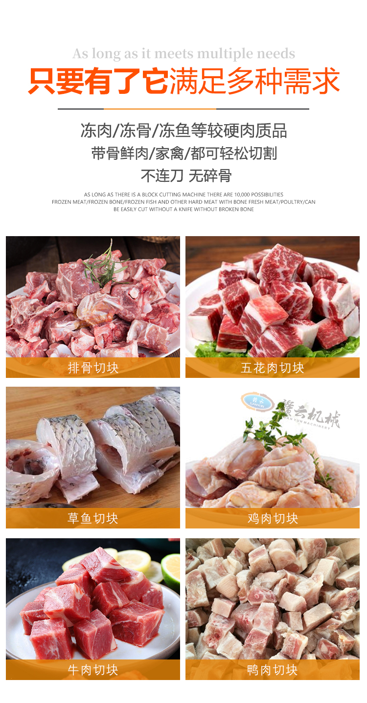 適用于帶骨家禽、凍肉、凍魚、排骨等肉制品的快速一次切塊。
