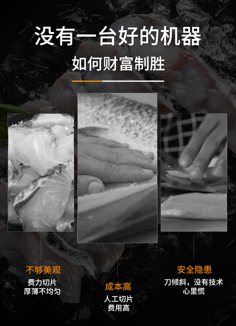 適用于加工斜切三文魚、魷魚、酸菜魚片、豬肝片、牛肉片等食材。