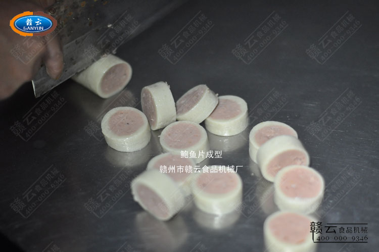 3、鮑魚(yú)棒成型:一臺(tái)泵浦灌腸機(jī)灌漿,一臺(tái)泵浦灌腸機(jī)灌肉餡,都連接鮑魚(yú)片成型工具成型鮑魚(yú)棒,通過(guò)加熱水槽定型熟化,再由切菜機(jī)切斷成鮑魚(yú)片。
